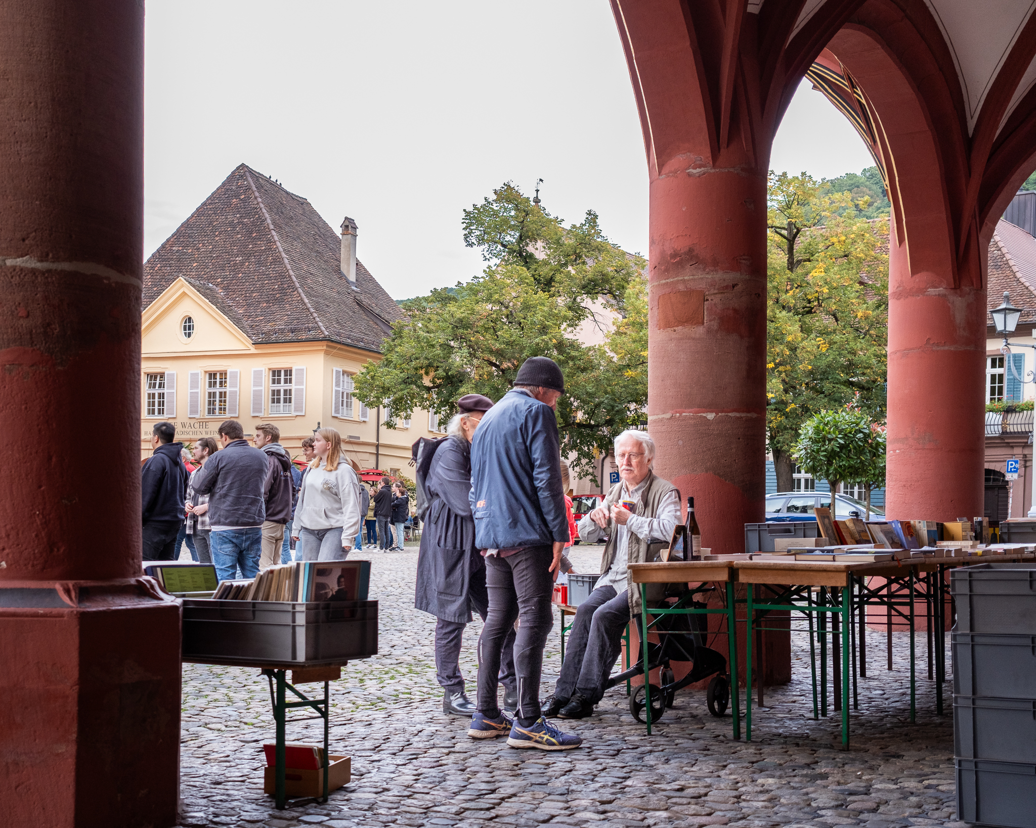 Drei Menschen im Gespräch mitten in den Auslagen des Antiquariats, am Eingang des Historischen Kaufhauses am Münsterplatz.