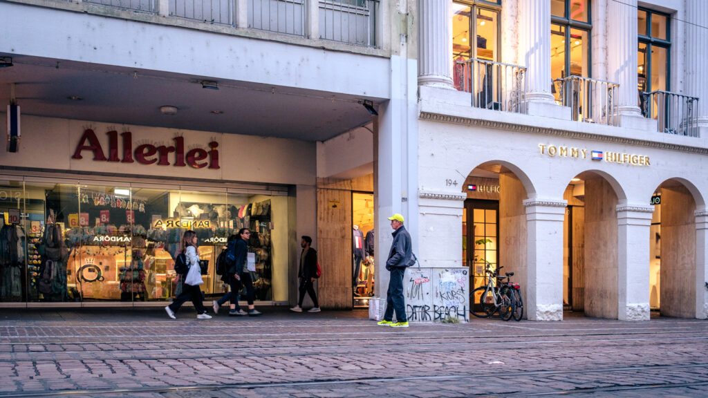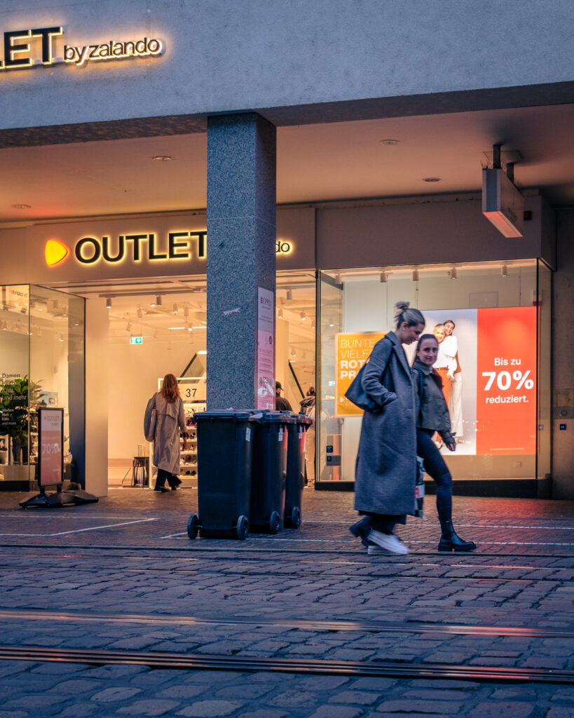 Die zwei Frauen haben’s eilig, unterhalten sich und gehen zügig am Schuh-Outlet vorbei, das die einfache Beton-Arkaden und den Straßenrand am frühen Abend in orangene/rötliches Licht färbt.