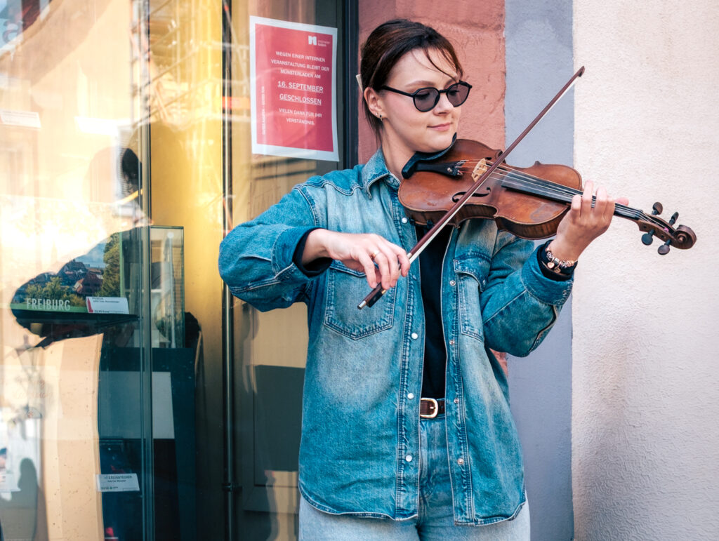 Manchmal hole ich mir eine Fotografieerlaubis für ein spontanes Streetportrait, wie hier bei der Violinistin, durch Augenkontakt und deute mit fragenden Blick dabei gleichzeitig auf meine Kamera. Ein kurzes Nicken triggert mich dann.