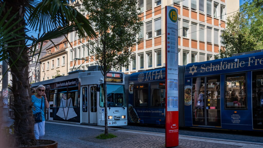 Fahrräder teilen sich oft mit der Stadtbahn die gleiche Spur. Das scheint stressfrei und entspannt in der “Green City” zu funktionieren, wie wir oft beobachten. Ich mag ja solche “Suchbilder” mit mehreren Personen und Szenen, da sie oft mehrere Geschichten erzählen können.