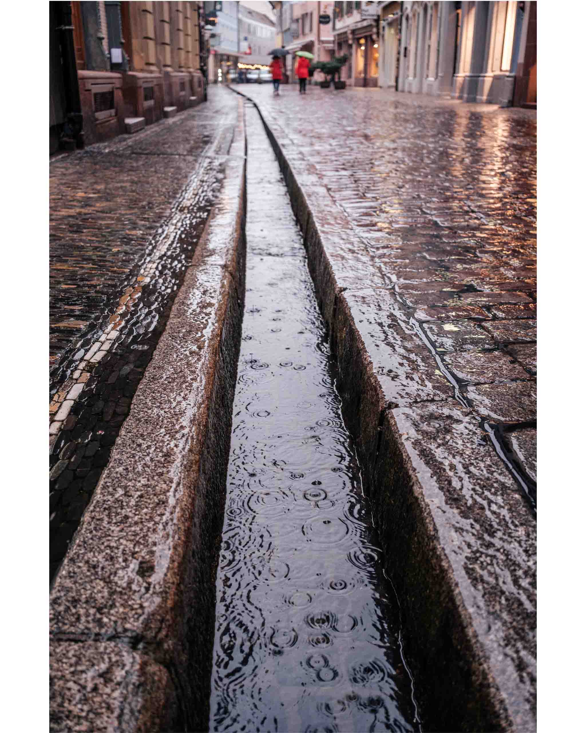 Die Bächle verlaufen durch fast alle Straßen und Gassen der Altstadt Freiburgs und haben ihren Ursprung in der mittelalterlichen Wasserversorgung. Heute werden sie vor allem zur Verschönerung des Stadtbildes und, dank Verdunstung, zur natürlichen Kühlung an Sommertagen genutzt. Im aktuellen Bild stammt das Wasser im Bächle vom Regen. In der Regel stammt es aber aus dem Fluss Dreisam. Quelle teilweise Explorial